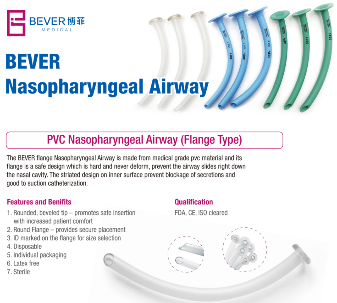 Der PVC-Nasopharyngeal-Atemweg ist in Flansch- und Trompetenausführung erhältlich. Die flansch- und trompetenförmigen Teile dienen dazu, die Platzierung der Atemwege zu sichern und zu verhindern, dass die Atemwege in der Nasenhöhle nach unten rutschen. Beide Arten von Atemwegen haben abgeschrägte Spitzen, die das Einführen erleichtern.